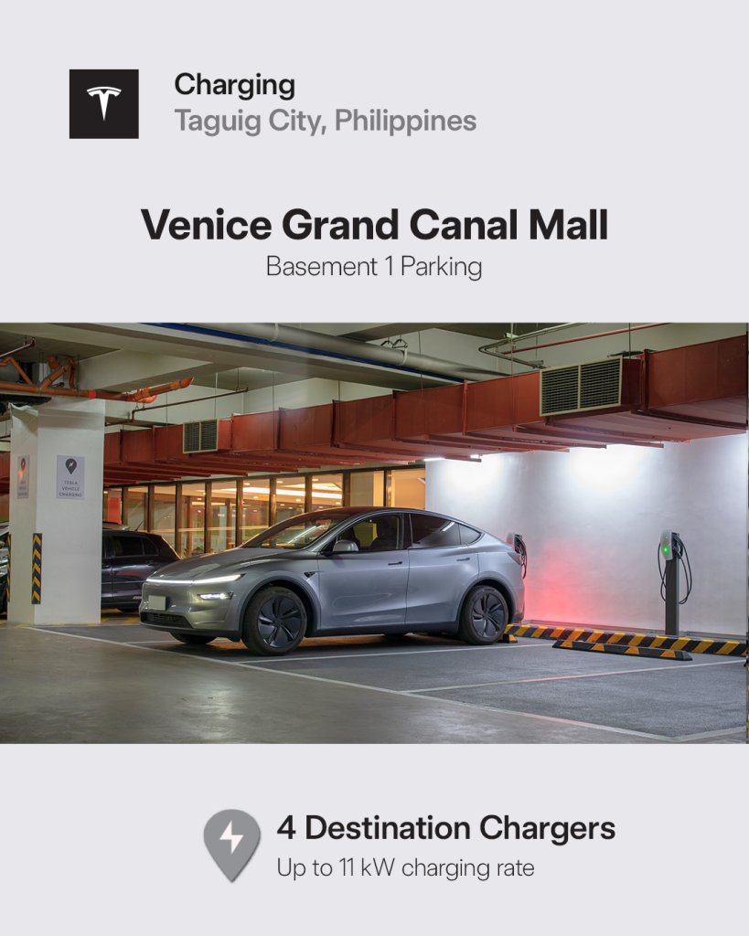 Lastly, one of the top lifestyle malls in Taguig, Venice Grand Canal Mall in McKinley Hill, now offers four (4) destination chargers perfect for topping up your Tesla while you shop, dine, or enjoy the mall’s Venetian-inspired charm.