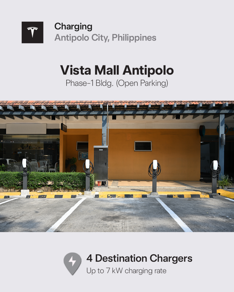 Located East of Metro Manila, Destination Charging is now conveniently available at Vista Mall in Antipolo. This facility is specifically designed to provide Tesla owners in the East with easy access to charging options, ensuring that they can enjoy their drive to and from the city without the worry of running low on battery.