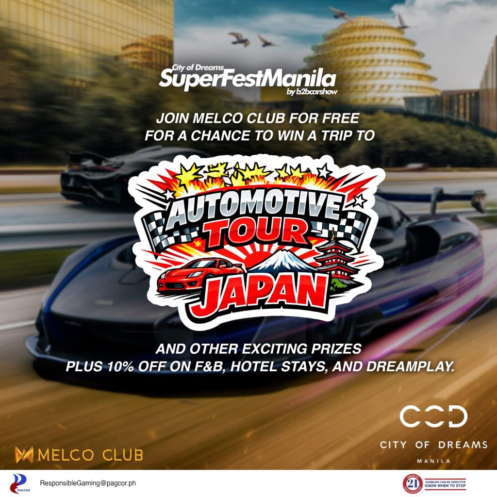 To amp up the excitement, new Melco Club Rewards members who sign up during the two-day event, and existing members attending the show, qualify for the chance to win the grand raffle prize of an all-expense paid three-night automotive tour in Japan for one person, in partnership with Autotour Japan. Other exciting raffle prizes are comprised of gift certificates: three overnight stays for two at a Deluxe Room with breakfast at Nobu Hotel Manila; three DreamPlay participant tickets for two, three one-hour renewal massage at Nobu Spa; and dining credits at the resort-operated outlets. The raffle draw winners will be announced at CenterPlay on the second night at 8 p.m. Terms and conditions apply.