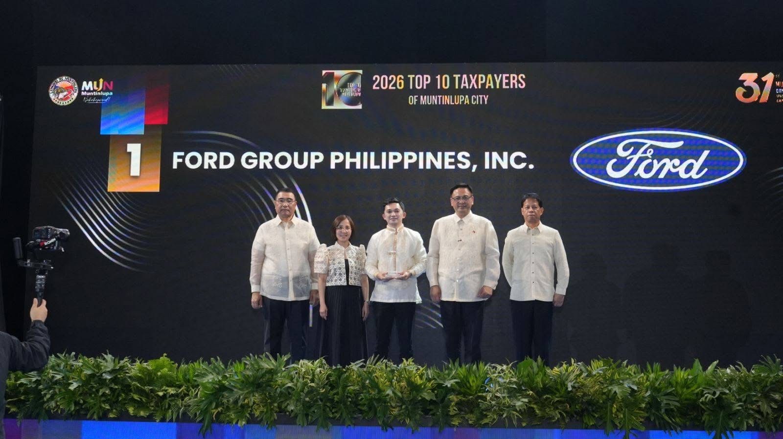 Receiving the award on behalf of Ford Philippines is Kent Primor (3rd from left), director, Government and Corporate Affairs, Ford Philippines. Present during the awarding ceremony at Muntinlupa City’s 31st cityhood anniversary last March 2, 2026 were (L-R) Engr. Allan A. Cachuela, City Administrator, Muntinlupa City; Jo-Anne Matas, director, Tax, Ford Philippines; Rozzano Rufino “Ruffy” B. Biazon, City Mayor, Muntinlupa City; and Gary Llamas, Head, Local Economic Investment and Promotion Office, Muntinlupa City.