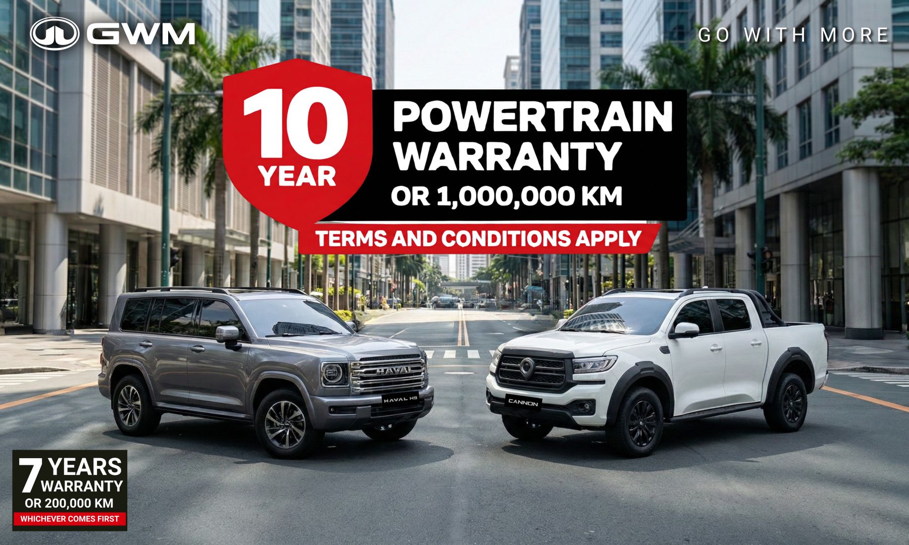 The 10-Year / 1,000,000 KM Powertrain Warranty applies to the following models in the GWM Philippines lineup: