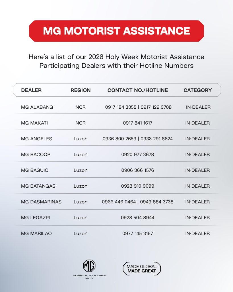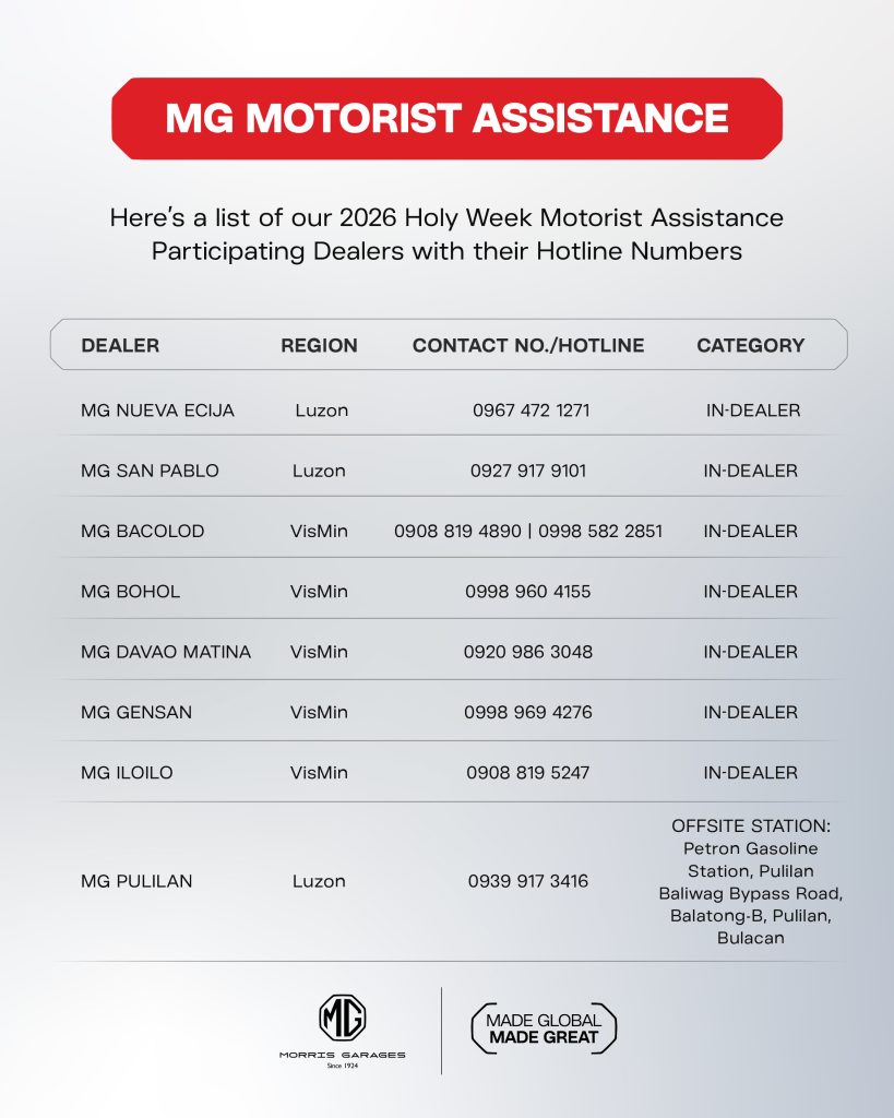 In line with its commitment in delivering exceptional customer care and promoting road safety, MG Philippines announces the rollout of its 2026 Holy Week Motorist Assistance Program, scheduled from April 2 to 5, 2026 (Maundy Thursday to Easter Sunday).