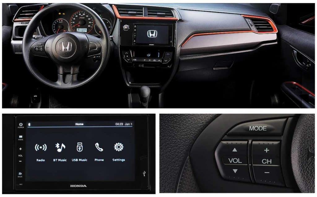 The interior of the Brio RS reflects the sporty exterior. The variant’s RS Design cabin with orange accents is highly emphasized on both dashboard and door trims. Paired with black fabric seats with orange accents, this gives the driver and passenger a sportier and upscale appearance.