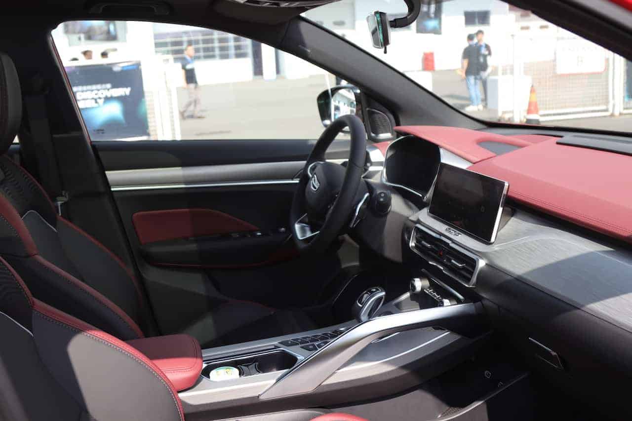 The sporty red-and-black interior of the Geely Coolray