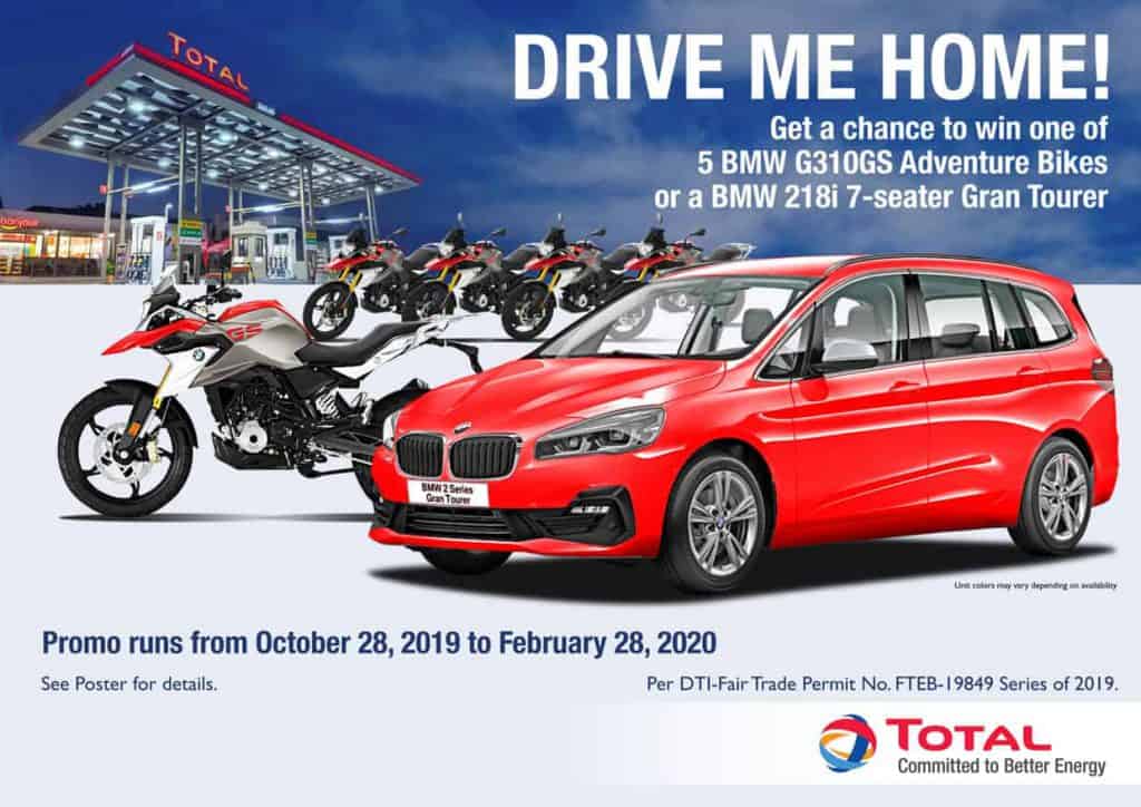 Total Philippines is giving away five BMW G310GS Adventure Bikes and one 218i seven-seater Gran Tourer for its “Drive Me Home!” promo. A customer can get two raffle coupons for every P500 worth of Total Excellium fuels, one raffle coupon for every P500 purchase of Total Premium Unleaded and Regular Diesel, or P250 worth of purchases in Cafe Bonjour. The customer must present proof of purchase or receipt to the cashier where the fuel purchase was made. On the other hand, a customer is entitled to two raffle stubs for every purchase of any Total lubricant.