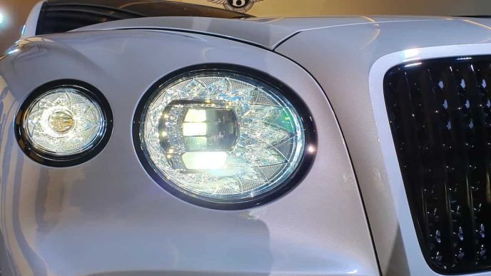 Headlamps bear LED matrix lighting as standard. This allows the driver “to operate on main beam all the time, automatically cutting a hole in the beam around oncoming vehicles to avoid dazzling other drivers. Matrix headlights feature unique, cut-crystal effect detailing. A chrome sleeve was added behind the cut element, making them sparkle even when not lit.”