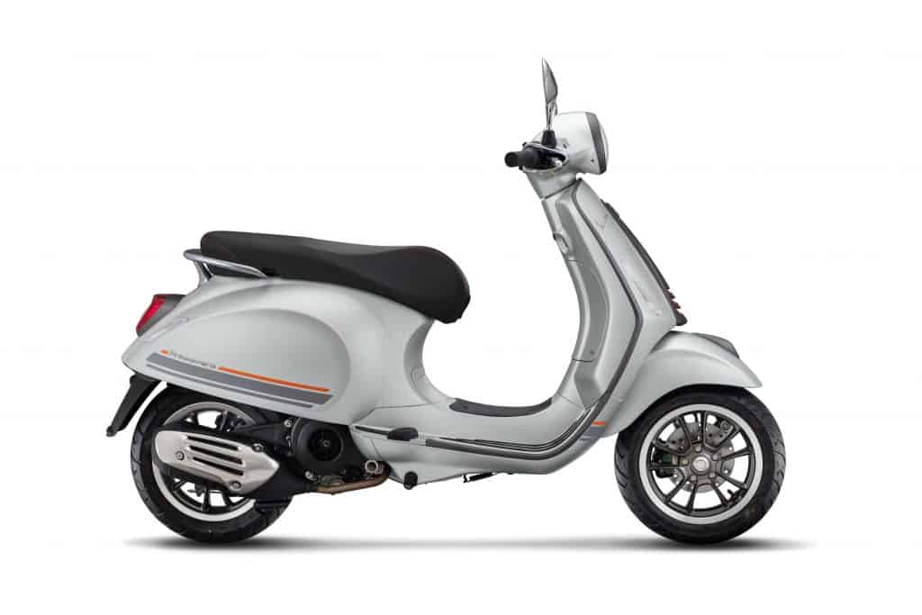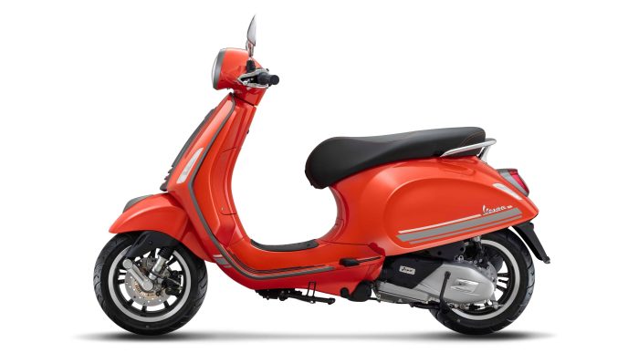 This Vespa model bears a dark grey shield edge, crest, rims, tie, rear and front light frames – along with sporty stickers contrasting with the color of the body. The boldness of the vehicle is stressed by features such as the black saddle with orange stitching and the orange horn cover.