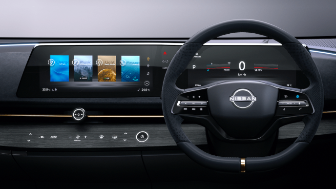 The Nissan Ariya Concept’s display keeps driving information in an instrument cluster location similar to that of a traditional car, while displaying entertainment information, comfort controls and system status in the center screen. Both are wrapped together in a sleek panel that flows seamlessly between driver and passenger.