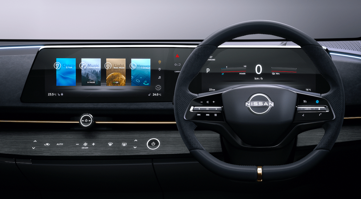 The layout reflects Nissan’s new Timeless Japanese Futurism design language, also expressed in the Ariya Concept’s unique frontal “shield.” But the horizontal design wasn’t chosen for its good looks alone.