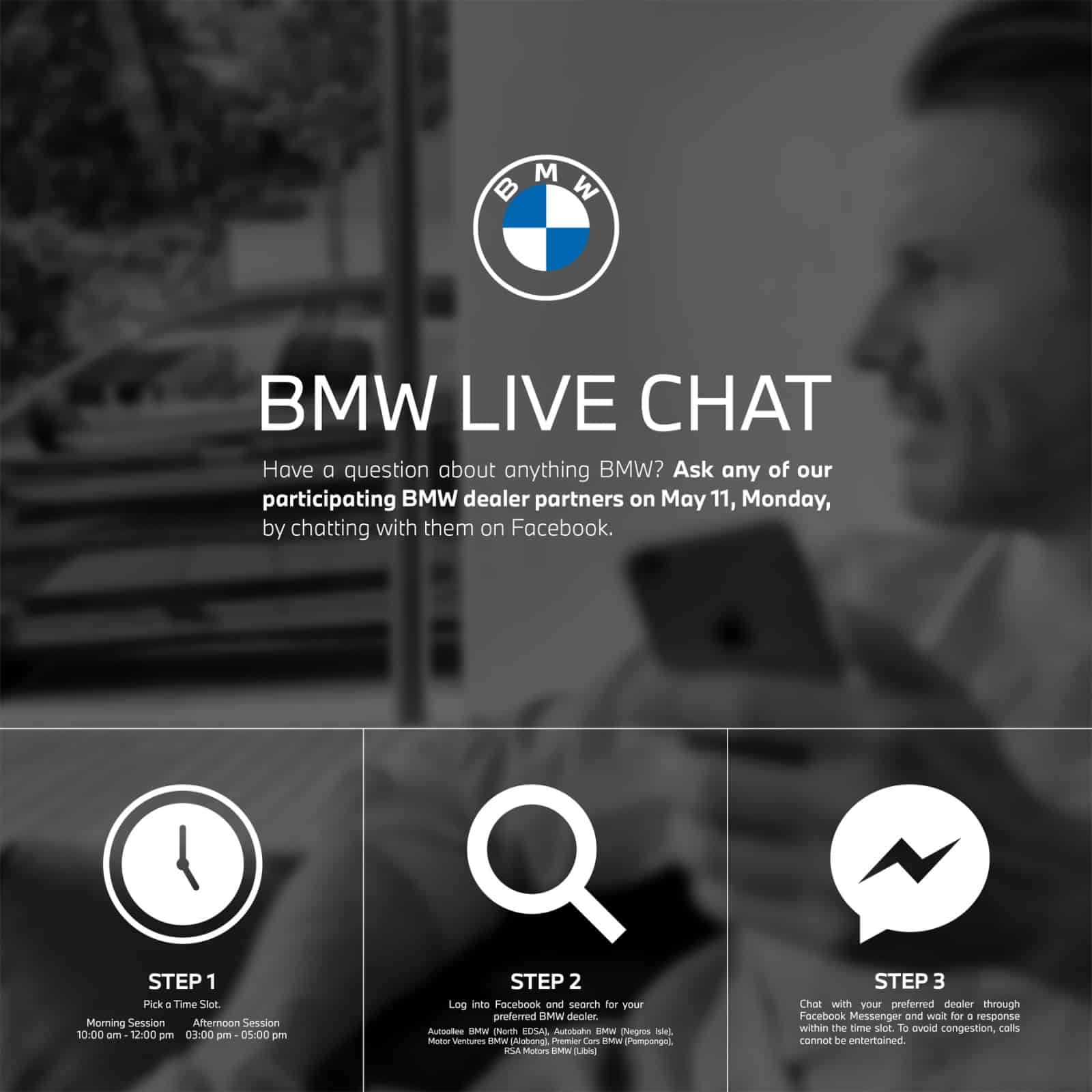 BMW in the Philippines will host a simultaneous live chat session with select dealer partners on May 11, allowing the network to engage with existing customers and aspiring BMW owners. Select BMW dealers will be standing by to communicate with participants for two hours in the morning (10:00 AM – 12:00 PM) and two hours in the afternoon (3:00 PM – 5:00 PM).
