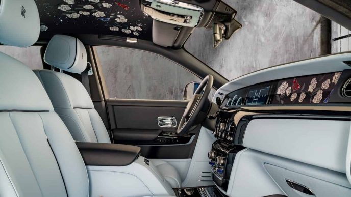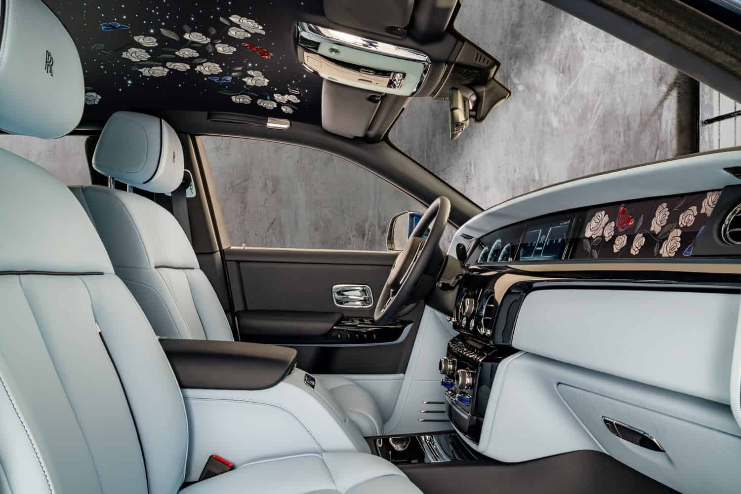 In 2017, an iteration of the rose debuted in a one-off design for Phantom’s Gallery. The Gallery is protected by an uninterrupted piece of glass that spans the width of the marque’s flagship, behind which a recess presents an up-lit stage, becoming an area for patrons to embrace the unique storytelling characteristic of the marque.