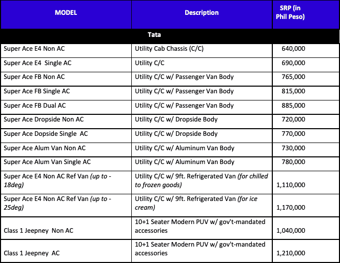 Pilipinas Autogroup, Inc. (PilipinasAuto) the official distributor of Tata Motors in the Philippines recently updated its pricing for the Tata Super Ace Mint.