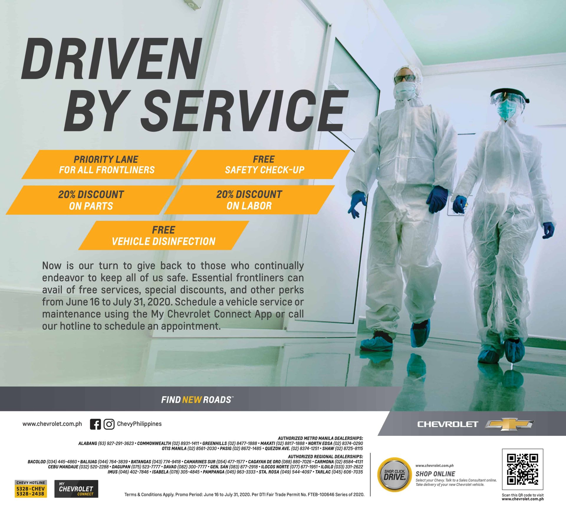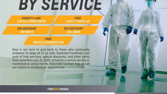A dedicated priority lane for frontliners is also placed in Chevrolet dealerships for a prompt and hassle-free vehicle service and maintenance. Customers who are qualified to avail of the offer are health workers, uniformed police and military personnel, and bank, supermarket, and drugstore employees.