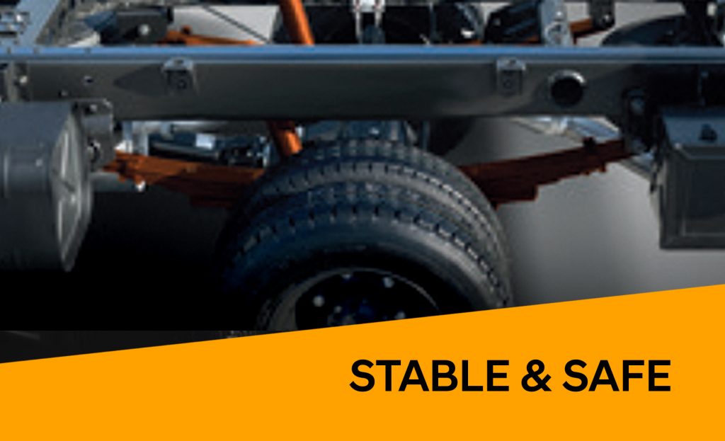 Already built with the finest grade steel and extra-rigid chassis, the HD36L is made stronger and more durable with its new ladder frame that features heavier gauge steel. The newly added stabilizer bar increases front-end rigidity and improves steering stability while the enhanced front suspension and shock absorber makes for uncompromised protection of vehicle and cargo.