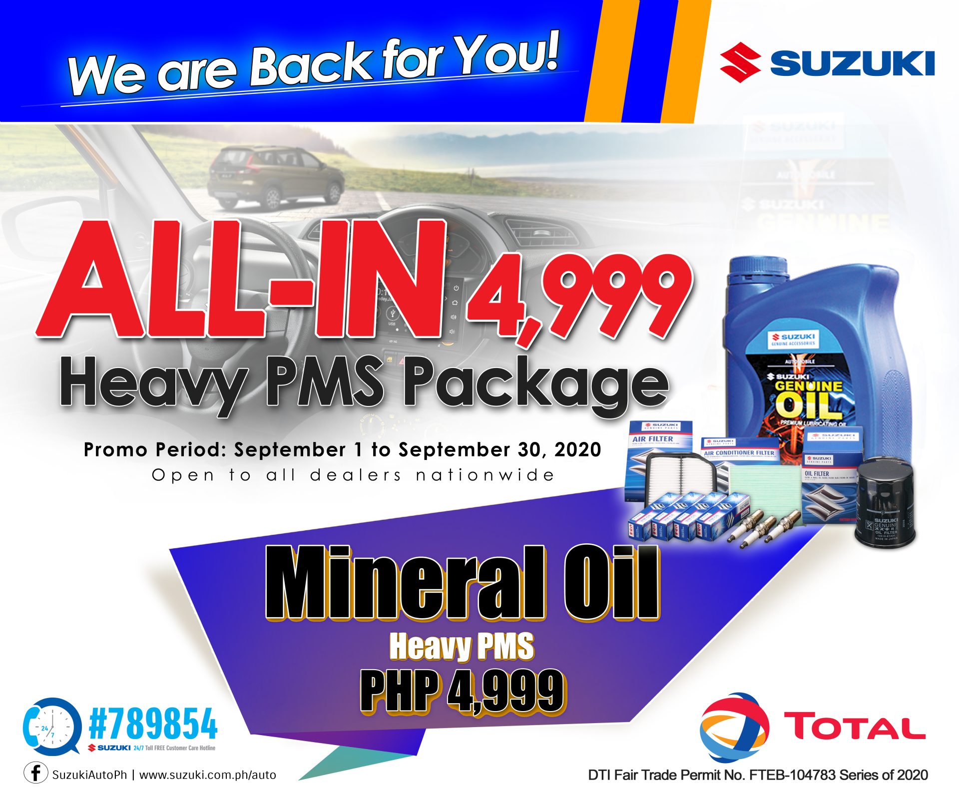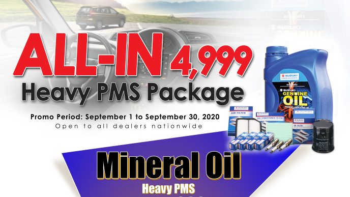 With the introduction of this newest feature on their website, SPH is more than delighted to announce their latest promo offering, The All-In 4999 Heavy PMS package promo! The package includes products and essentials: Suzuki Genuine Mineral Oil (5W30), Oil Filter, Drain Plug Gasket, Spark Plugs, Air Filter, Brake Fluid, Engine Coolant, Brake Cleaner, Manual or Automatic Transmission Fluid to make sure that your Suzuki reliable vehicle is able to perform at its optimum level! All these amazing inclusions for only Php4,999.00 until September 30, 2020! This promo is applicable to all authorized Suzuki Authorized Automobile dealerships nationwide, customer vehicle owners due for Heavy PMS and Suzuki vehicles that are eligible for PMS with the required reached kilometers! For more information about the All-In Heavy 4999 Heavy PMS package promo, you may visit the Suzuki website!