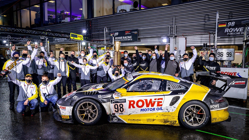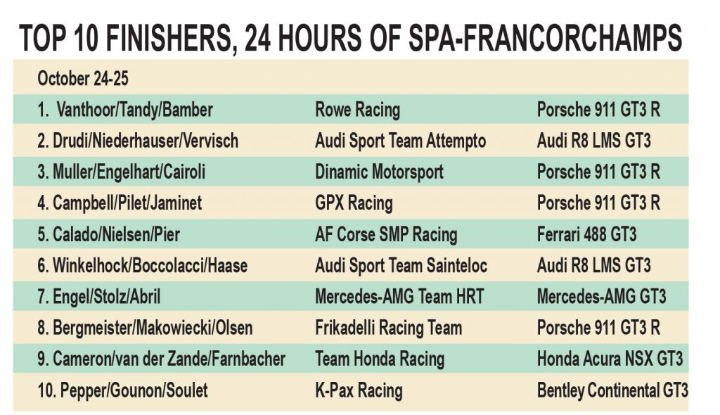 After racing for exactly 24 hours and 38.7 seconds in the 7.004-kilometer-long, mostly soaking wet Spa-Francorchamps circuit in Belgium, the Porsche 911 GT3 R of Rowe Racing team completed 527 laps, for a total distance of 3,691 kilometers, and took the checkered flag 4.7 seconds ahead of its closest rival, the Audi R8 LMS GT3 of Audi Sport Team Attempto Racing. Another Porsche 911 GT3 R, that of Dinamic Motorsport, crossed the finish line 28 seconds later to secure third place and complete the podium at the 2020 edition of the 24 Hours of Spa-Francorchamps, held on Oct. 24-25.