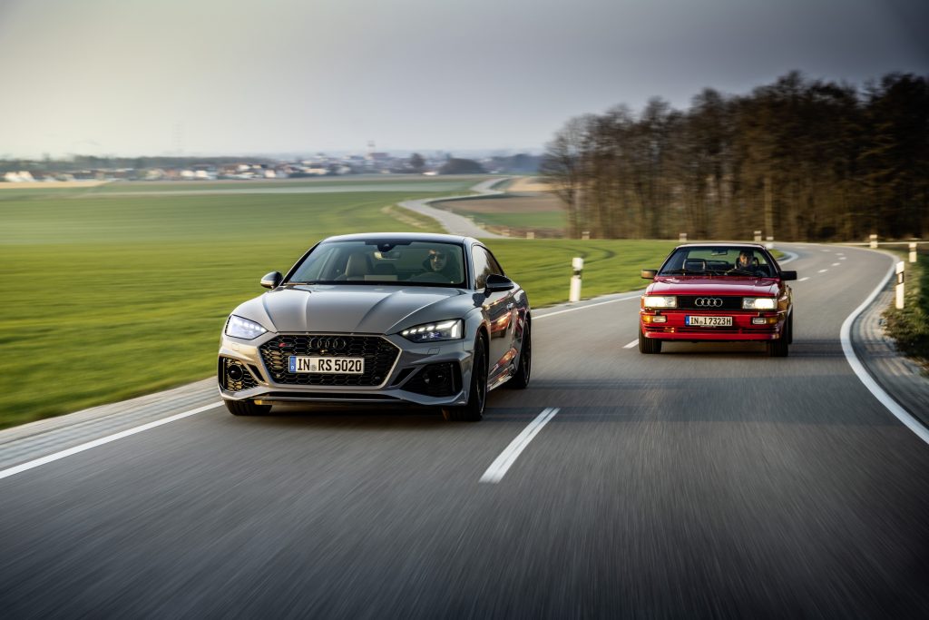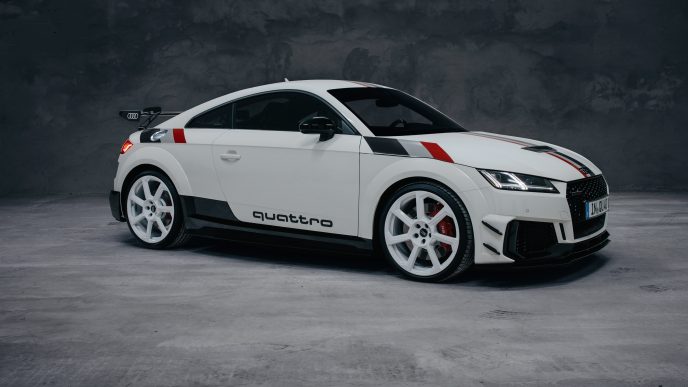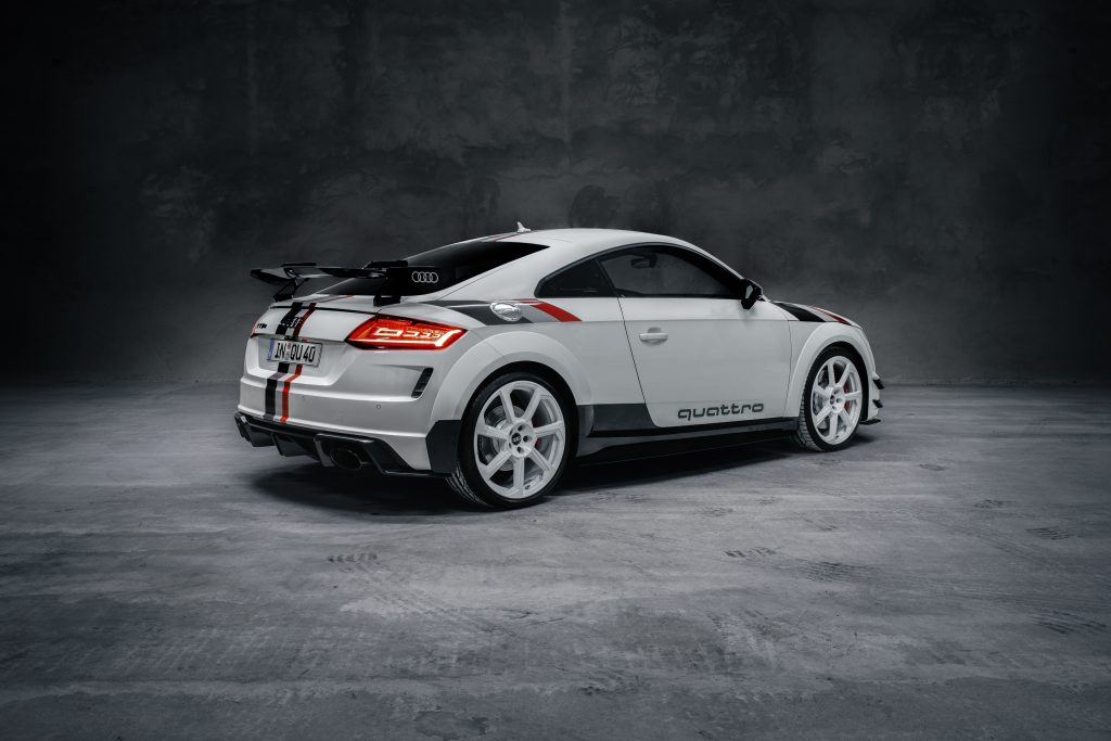 To celebrate the quattro’s latest milestone, Audi is presenting 40 examples of the special-edition Audi TT RS 40 years of quattro. Coming in Alpine White decals honoring the livery of the S1 Rohrl drove in Pikes Peak, the car is also marked by a hood with central air vent in gloss carbon, an aero kit in gloss black with a fixed rear wing, special commemorative badges, and red brake calipers peeking behind white, 20-inch alloy wheels.