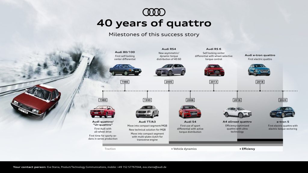 From the original quattro, which remained in Audi’s product range until 1991, among the subsequent significant developments of the technology were the “short” Sport quattro car of 1984, and the Audi 80 quattro introduced in 1986 whose all-wheel drive system could evenly split the engine’s torque between the front and rear axles, or, if needed, transfer up to 75% of this to the axle with better traction.