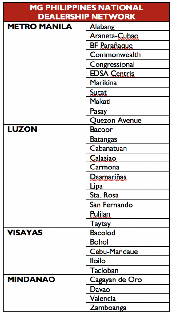 MG Philippines’ dealership network currently includes, in Metro Manila: Alabang, Araneta-Cubao, BF Parañaque, Commonwealth, EDSA Centris, Marikina, Sucat, Makati, Pasay, Quezon Avenue, and Congressional; in Luzon: Batangas, Cabanatuan, Carmona, Dasmariñas, Lipa, Sta. Rosa, San Fernando, Pulilan, Taytay, Bacoor, and Calasiao; in the Visayas: Cebu-Mandaue, Iloilo, Tacloban, Bohol, and Bacolod; and in Mindanao: Davao, Cagayan de Oro, Zamboanga, and Valencia.