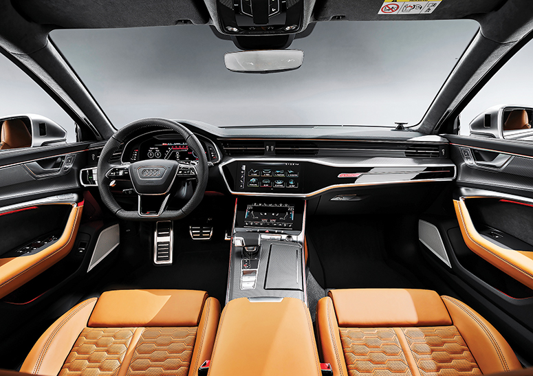 The new RS 6 Avant is roomier than previous versions, with increased luggage space. Its interior features a perforated sport leather-wrapped, flat-bottom steering wheel; large RS aluminum shift paddles; sport seats; and plenty of RS and RS 6 badges. The car’s all-digital operating system has a black-panel design, and an “RS Monitor” display provides information on the temperature of the drive components, the maximum g acceleration figures, and tire pressure and temperature.