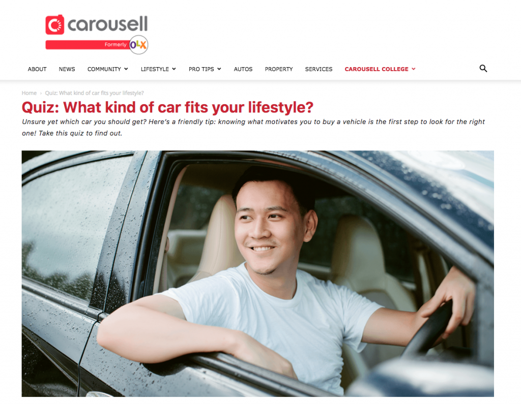 Users also get access to important and well-written how-to articles beneficial for both car owners and future owners via a dedicated car blog. Carousell Autos has easy-to-use tools to guide first-time vehicle buyers along as they search for their ideal mobility. An online quiz walks the searcher through what he or she is looking for, and recommends vehicles based on responses as well as budget appetite.