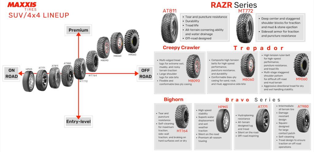 Among the new SUV and 4×4 tire collection available to Filipino consumers are the Maxxis RAZR MT772 and the Maxxis RAZR AT811.