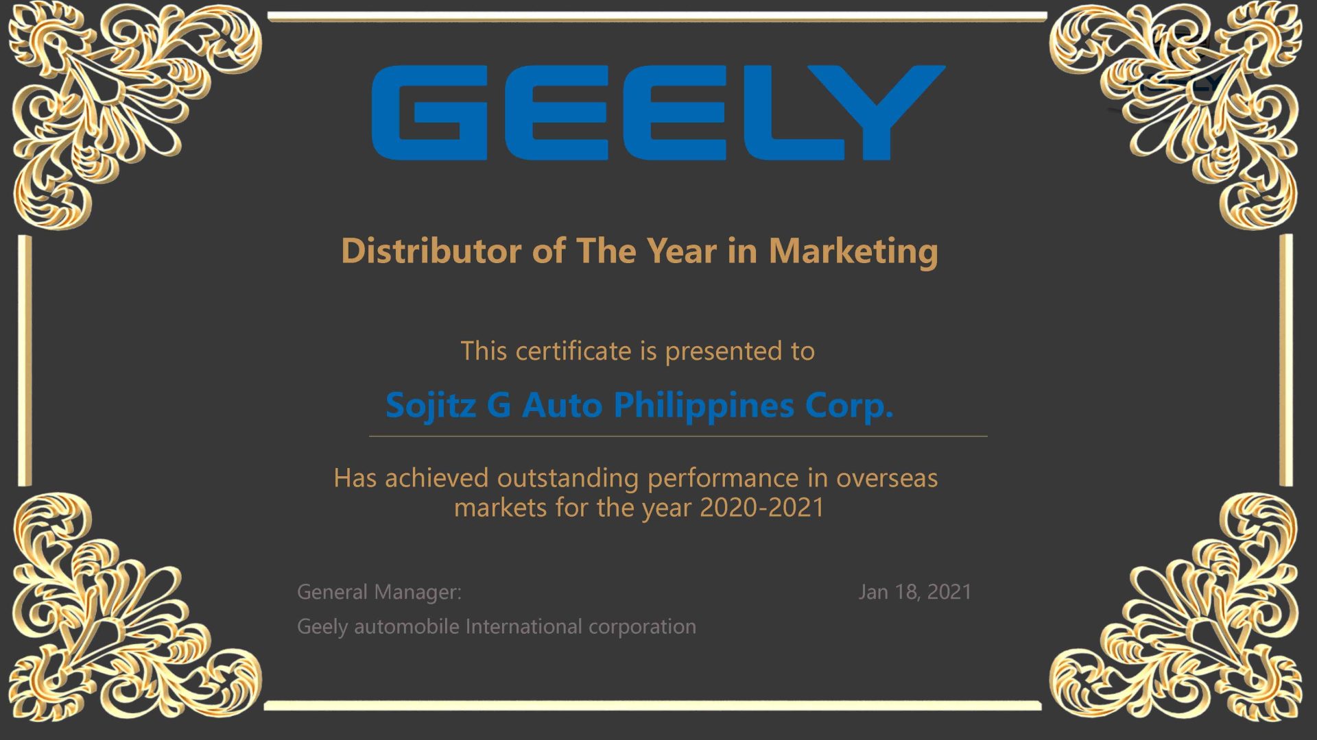 During the conference, GAIC also has recognized SGAP as the Distributor of the Year in Marketing. GAIC Deputy General Manager Jenny Jin commended SGAP for being able to exceptionally perform in spite of the continuing Covid-19 pandemic and restrictions. Jin also mentioned that in 2020, Geely has the highest export volume to the Philippines among all Chinese brands.