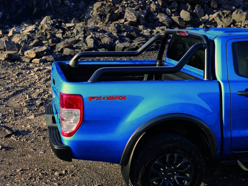 In terms of design, the Ranger FX4 MAX’s exterior boasts the iconic F-O-R-D grille and a full-length tubular sports bar finished in matte black.