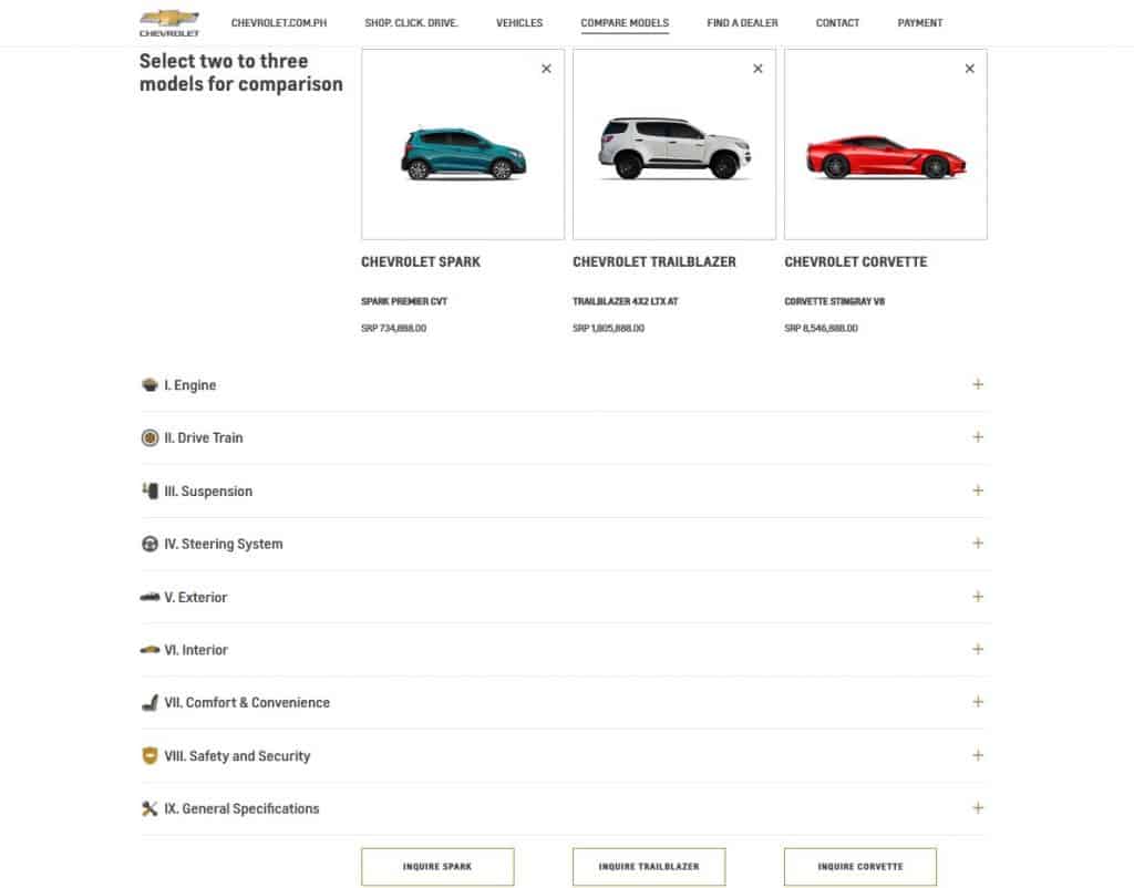 Customers can head on to shopclickdrive.com.ph and see Chevrolet Philippines’ full lineup, from the Spark all the way to the Corvette. They can filter by type, transmission, or fuel; do comparisons of up to three models, or schedule a test drive.