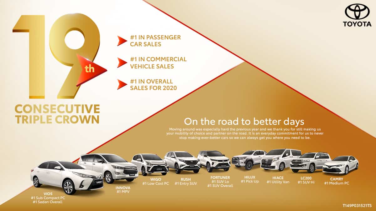 With Toyota’s strong performance last year, the company took the top spot in nine key segments. Toyota also managed to achieve a 41.3% overall market share and garnered its 19th consecutive Triple Crown victory. The Triple Crown commended TMP’s leadership in passenger car sales, commercial vehicle sales, and overall sales.