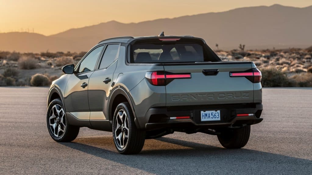 The name Santa Cruz is such a tame and classic name for a pickup that looks futuristic and menacing. It has the same fascia that Hyundai uses on its newest models, featuring an LED-lighting array that matches the look of the grille itself. The A-pillar is sleeker while the C-pillar is slanted, unlike typical SUVs, presenting a more modern approach to the pickup design. The back is very distinct with its horizontal T-shape taillights and the bold name stamped at the tailgate.