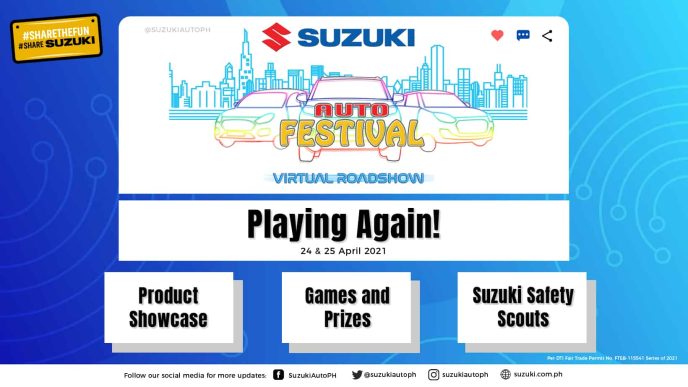 Due to the current limitations of the Modified Enhanced Community Quarantine, and for the safety of the general public, Suzuki, as was the case last year, will once again host its Auto Fest Roadshow virtually on Suzuki Philippines’ Facebook page. This year’s show schedules are as follows – 11:00am, 3:00pm, and 6:00pm, while the Kids’ Scout Safety seminar will be held at 1:30pm.