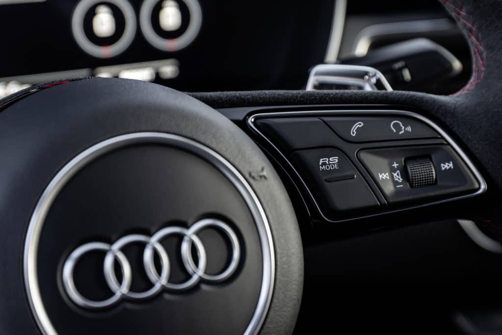 The model’s futuristic interior design is focused on the new 10.1-inch MMI touch display that provides acoustic feedback, and which has menu that is as simple and intuitive to access as a smartphone’s. Shown on the 12.3-inch Audi virtual cockpit are special RS displays for information about tire pressure, torque output, engine oil temperature, boost pressure, and g-forces generated. Timing for lap sessions and acceleration runs can be activated via a button on the steering wheel.