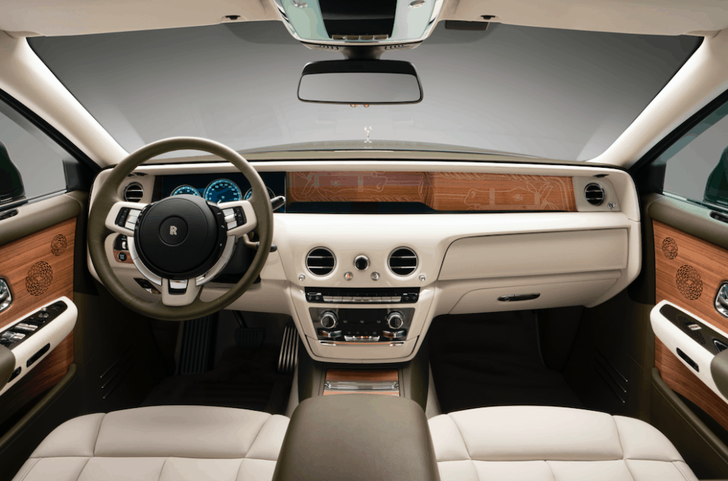 Hermès brings its distinctive equestrian heritage and innovative craftsmanship know-how to the car, with the leather upholstery created using stitching and edge-painting techniques originally employed by master saddlers. For Phantom’s Gallery, a feature unique to Rolls-Royce, that runs the length of the motor car’s fascia, Hermès commissioned an artwork based on a design by the celebrated French artist and illustrator Pierre Péron (1905–1988) who created many of the House’s iconic scarves. The work, inspired by the famous Hermès horse motif, is hand-painted on Open Pore Royal Walnut and is presented as though staged in an art gallery, behind glass.