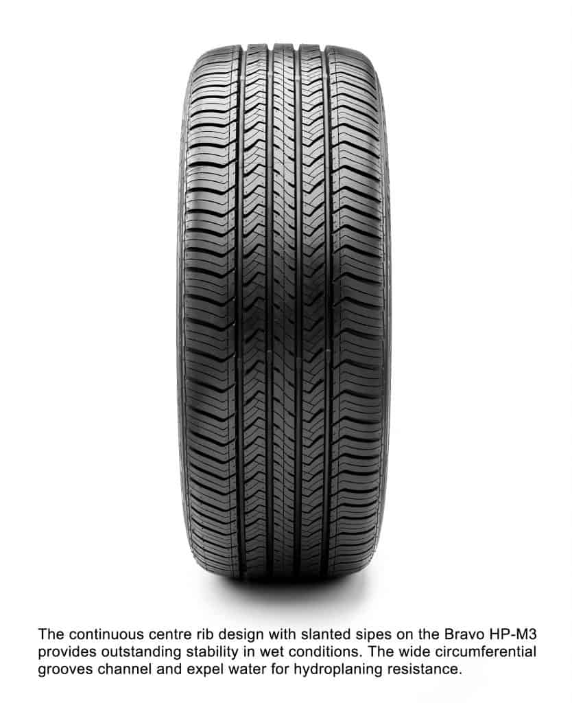 First up, the Bravo HP-M3. The perfect choice as an on-road tire that refuses to sacrifice speed, wet-road handling, comfort, and safety. In highway speeds, its continuous centre rib design with slanted sipes – the groove that gives the tire its grip – provides outstanding stability on wet conditions any Philippine driver experiences during the rainy season. Add in the wide circumferential grooves to channel and expel water for hydroplaning resistance and the Bravo HP-M3 reveals itself as a premium all-season touring tire. It is also surprisingly quiet for all that muscled grip.