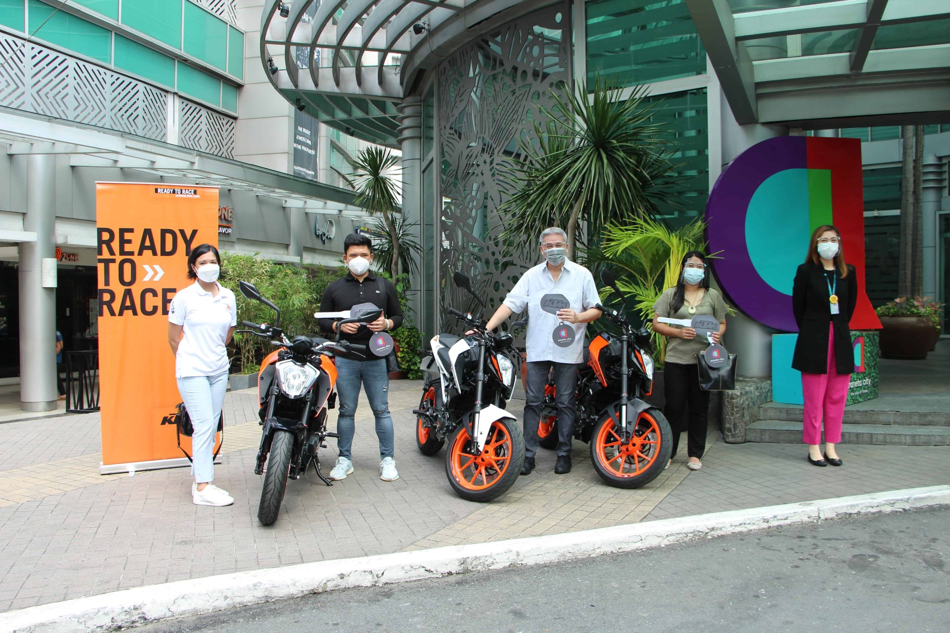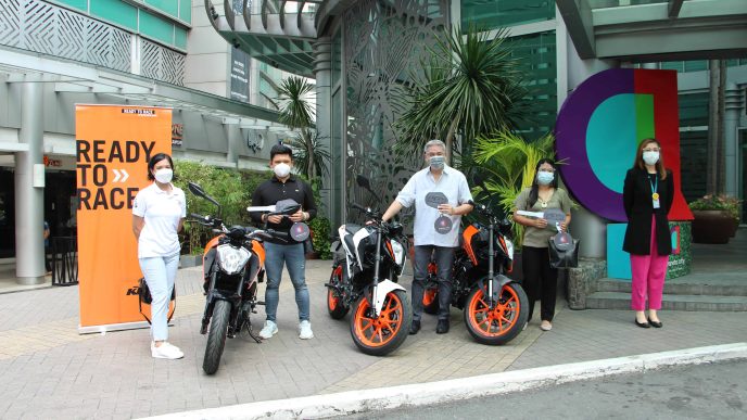 With the stringent implementation of social distancing measures, the awarding proper was held at the façade of the Gateway Pavillion on Friday, June 25, 2021. It was attended by Araneta City’s Assistant Vice President for Marketing Marjorie Go, and Adventure Cycle Philippines, Inc., KTM PH’s Community Engagement Anne Tayao.