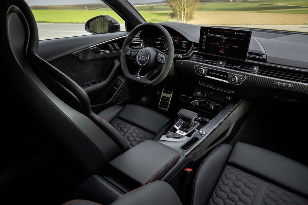 Complementing these are the quattro blisters—again an homage to the Quattro and the earlier Audi RS 4 Avant generation—located over the wheel arches which make the car 30 millimeters’ wider in front and back. The Black Optic Package adds a bold, sporty look, as do the RS sport exhaust system with black tailpipes.