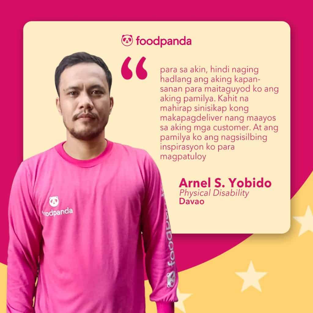 Arnel Yobido previously worked as a family driver and is now happily delivering good service in Davao City. Despite his challenges where he experiences pain in his leg while making deliveries, he is happy to be working as a foodpanda rider, especially as he and his wife are expecting a baby girl. “Kapag sumasakit ang binti ko, pinapahinga ko muna, patuloy akong lalaban para sa aking pamilya at sa mga pangarap namin.”