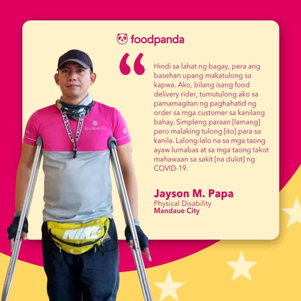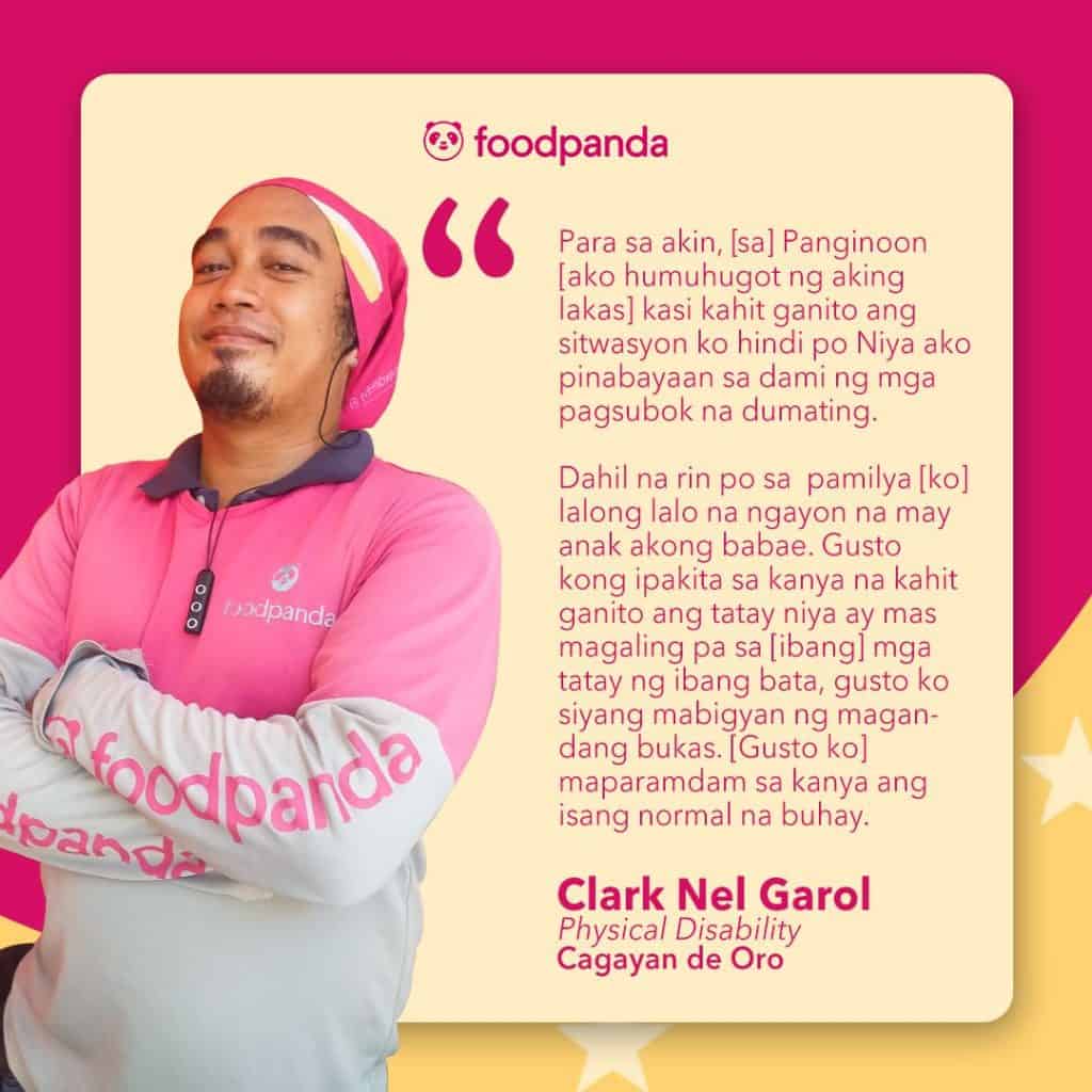 Clark Nel Garol was a construction worker and ‘habal rider’ before becoming a food panda rider. “Na-appreciate ako nang ibang customer nakita nila ako dahil sa kabila ng aking sitwasyon ay nagsusumikap daw ako. Tuwing narinig ko po sila na ganyan ang feedback nila sa akin, sobrang saya ko po. Mas lalo ko pa pinagbuti ang aking trabaho.”