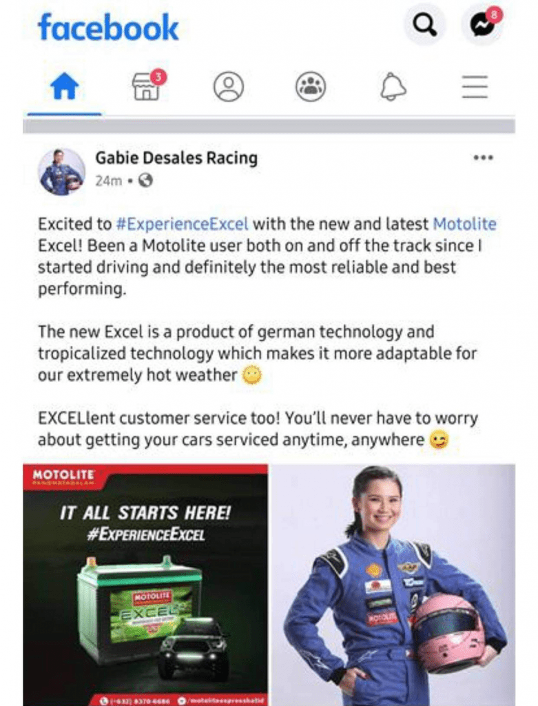 Gabie Desales Racing: “Excited to #ExperienceExcel with the new and latest Motolite Excel. Been a Motolite user both on and off the track since I started driving and definitely the most reliable and best performing. The New Excel is a product of German technology and tropicalized technology, which makes it more adaptable for our extremely hot weather. EXCELlent customer service too! You’ll never have to worry about getting your cars serviced anytime, anywhere.”