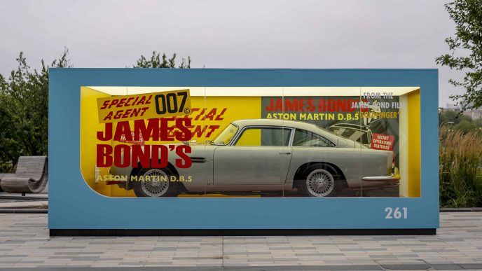 To celebrate the return of 007’s iconic Aston Martin DB5 to the big screen, Aston Martin and Corgi also unveiled a full-size replica of the original 1965 Corgi DB5 model. Located at The Coaling Jetty, outside Battersea Power Station, the life size model which measures 5.66 metres long, 2.7 metres tall and 2.7 metres deep, replicates the original Corgi design and houses an Aston Martin DB5 Goldfinger Continuation car. The DB5 is complete with a broad selection of working gadgets that fans will recognise from the classic James Bond film: rotating number plates, a retractable bullet proof rear shield, extending front over-riders and of course pop out machine guns.