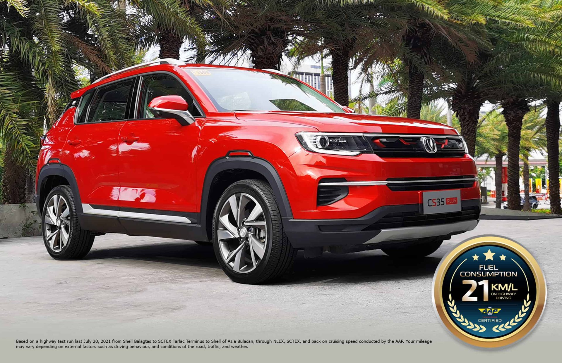 During a fuel economy run conducted by Changan Motor Philippines, Inc. (CMPI) and the Automobile Association of the Philippines (APP) on July 20 and 22, 2021, the 1.4L 7-speed DCT variant of the CS35 Plus yielded a fuel consumption of 21.432 km/L for highway test driving after it traveled 180.652 kilometers at a speed range of 60-85 kph.