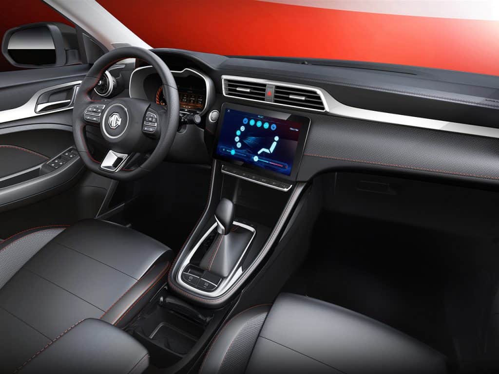 Inside, soft touch surfaces on the steering wheel, dashboard, center console, door panels, and other high-contact areas add a premium feel. Fine red stitching on the seats and trim, and red embroidered MG monograms on the driver and front passenger headrests add a touch of sportiness.