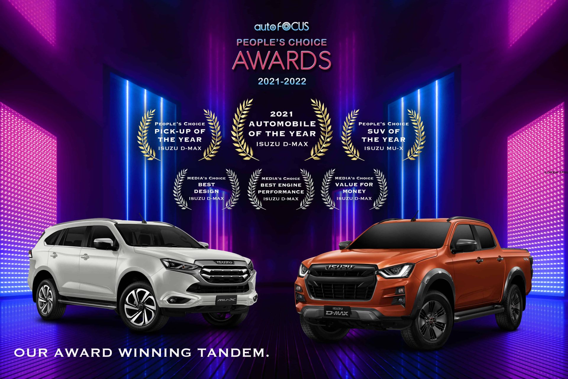 Isuzu Philippines Corporation (IPC) received multiple awards for their All-New Isuzu D-MAX and Isuzu mu-x models in the recently concluded 2021-2022 Auto Focus People’s Choice Awards (AFPCA) and Media Choice Awards (AFMCA).
