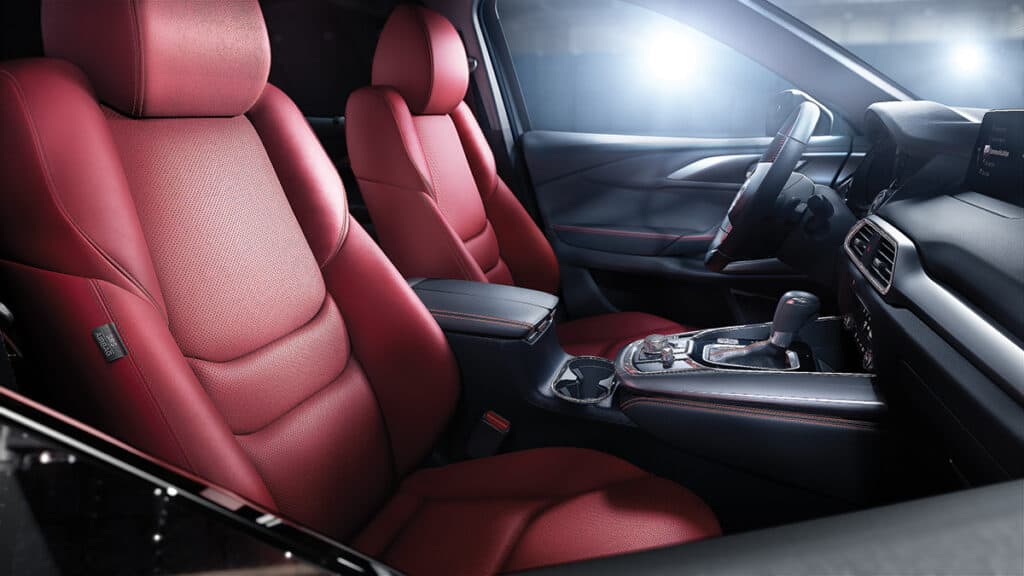 The CX-9 BLACK EDITION interiors make a bold statement with its supple leather seats in Burgundy and red stitching on the leather steering wheel. Both complement the elegant and classy dark finish and trim inside the cabin. Seat ventilation comes standard with the 8-way driver and 6-way passenger power-adjustable front seats.