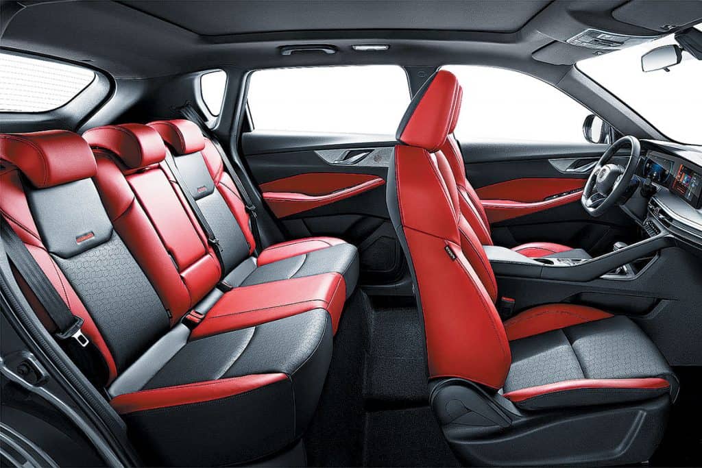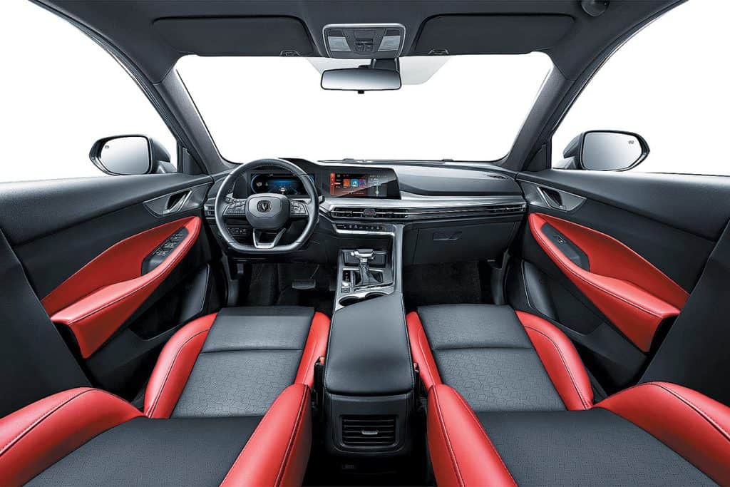 Like its large sibling, the CS75 Plus, the 2022 CS35 Plus now gets Changan’s signature split LED headlights with LED DRLs and front position lamps. The new grille features an obsidian rock formation pattern, while red accents wrap around the bumpers, sides, and rear. At the back, new full-width LED taillights, shark-fin antenna, and dual exhaust pipes give a sportier presence. Available 18-inch alloy wheels amp up the side profile.