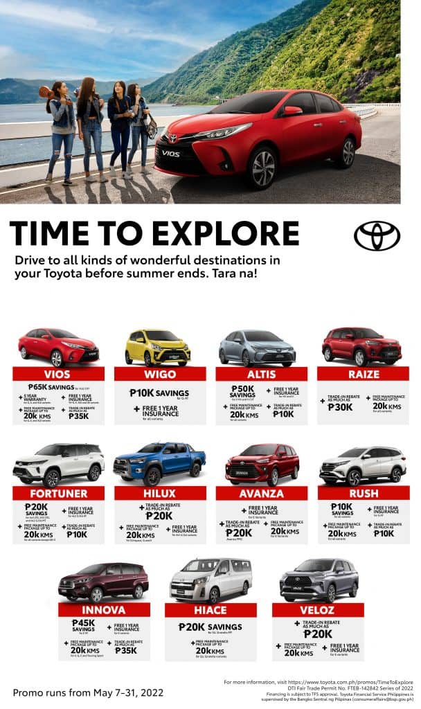 Don’t miss the chance to score a great deal! Promo runs from May 7 to 31, 2022. The full mechanics of these promos can be viewed at toyota.com.ph/promos/TimeToExplore