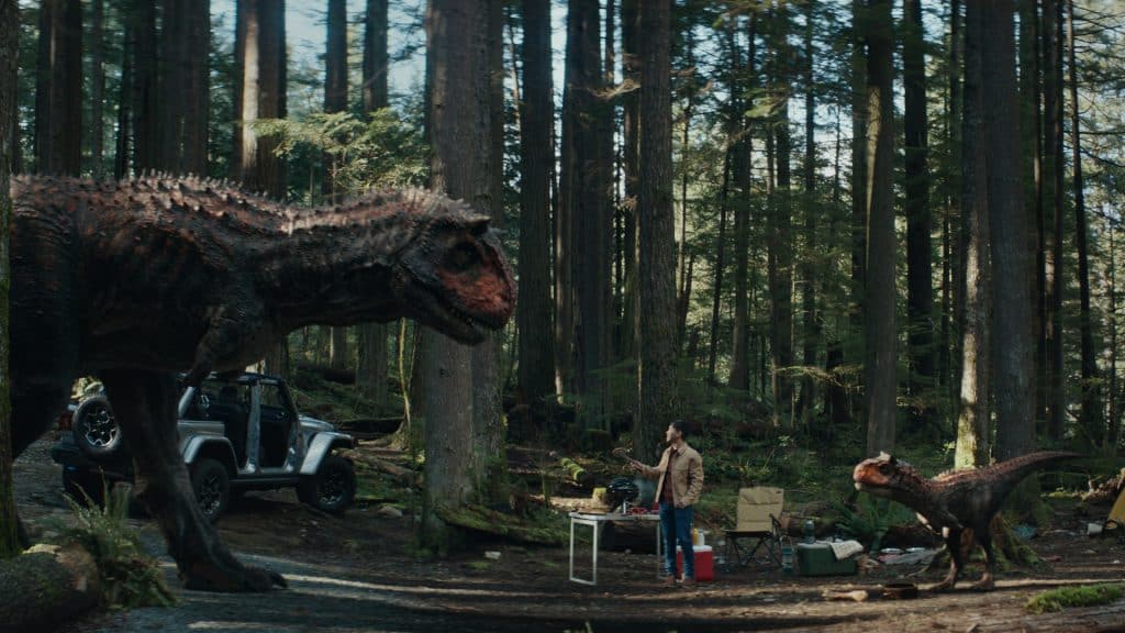 The one-minute Jeep brand commercial shows a Jeep Wrangler 4xe owner finding a newly hatched Carnotaurus in his own yard and deciding to faithfully take care of it. He takes the baby dinosaur on off-road adventures (engaging electric mode when quiet is called for!), while inducing both wide-eyed wonder from children and panic on neighborhood streets when he takes the dinosaur for daily walks along the avenue, before finding its mother during a camping adventure … with unexpected results. Turns out it was just his imagination running wild. Or was it?