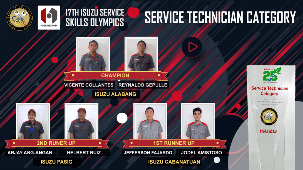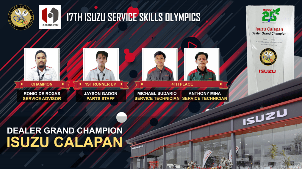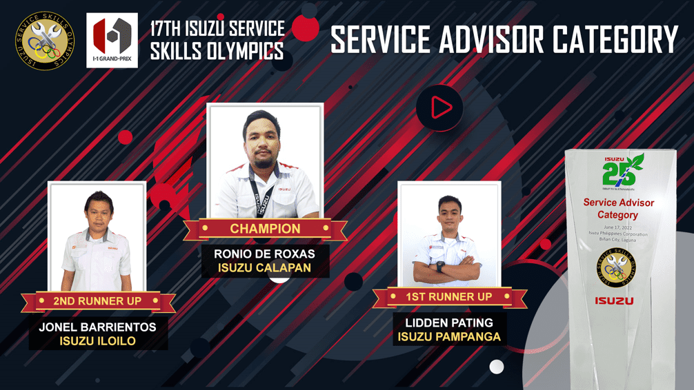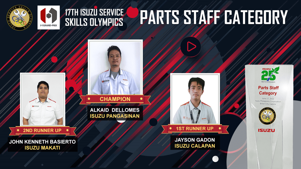 On June 17, Isuzu Philippines Corporation (IPC), held its virtual awarding ceremony for the Isuzu Service Skills Olympics (ISSO). Now on its 17th year, the ISSO is the annual service skills and knowledge competition of IPC open to all Isuzu dealerships nationwide. Since the pandemic, IPC has shifted the competition virtually and has been remotely assessing the skills of their dealer aftersales representatives covering three categories – namely for Parts Staff, Service Advisor, and Service Technician.