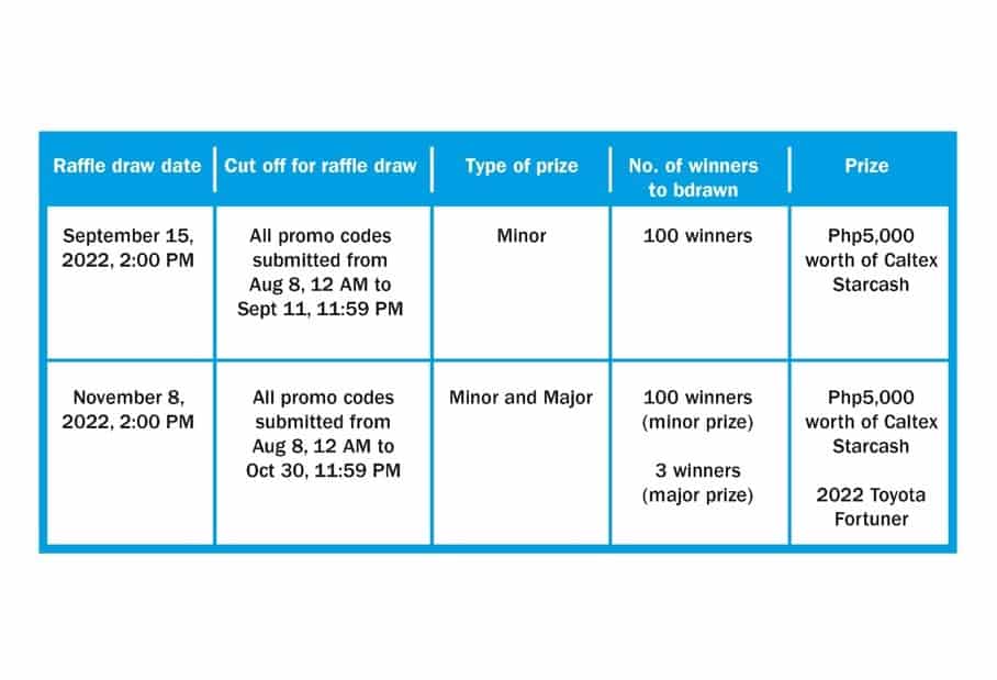 All entries from August 8 until October 30 will be selected in the raffle draw on November 8, 2022 to win Php5,000 worth of Caltex StarCash while three lucky motorists will each be given a brand new 2022 Toyota Fortuner.